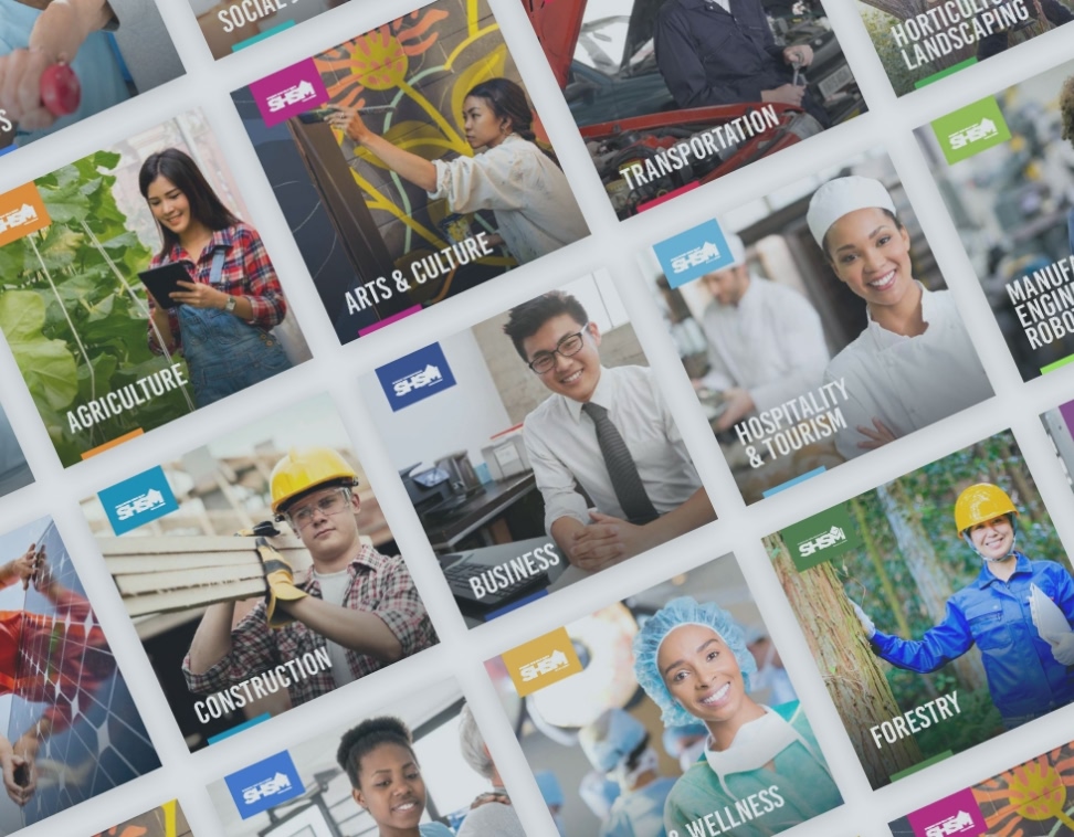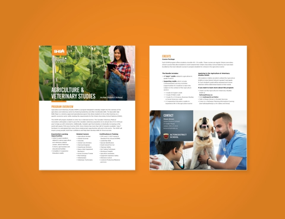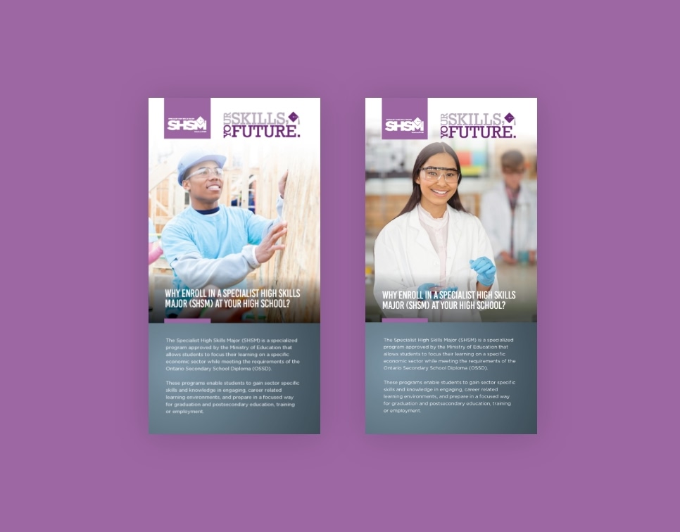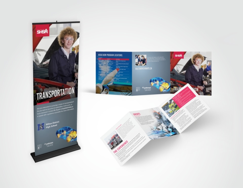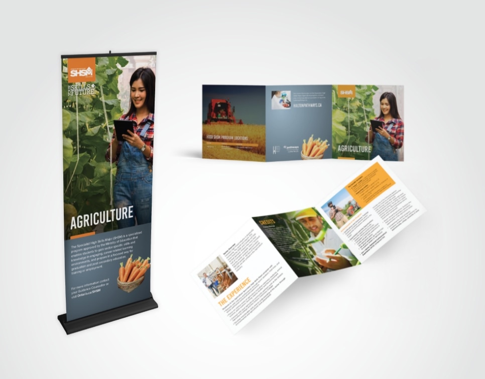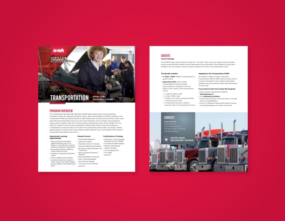 There are 19 Specialist High Skills Major (SHSM) programs offered in secondary schools Ontario. Most of the province’s 72 school boards offer at least some of the programs, but each board uses its own design and collateral to market them. We redesigned the collateral for Halton District School Board.